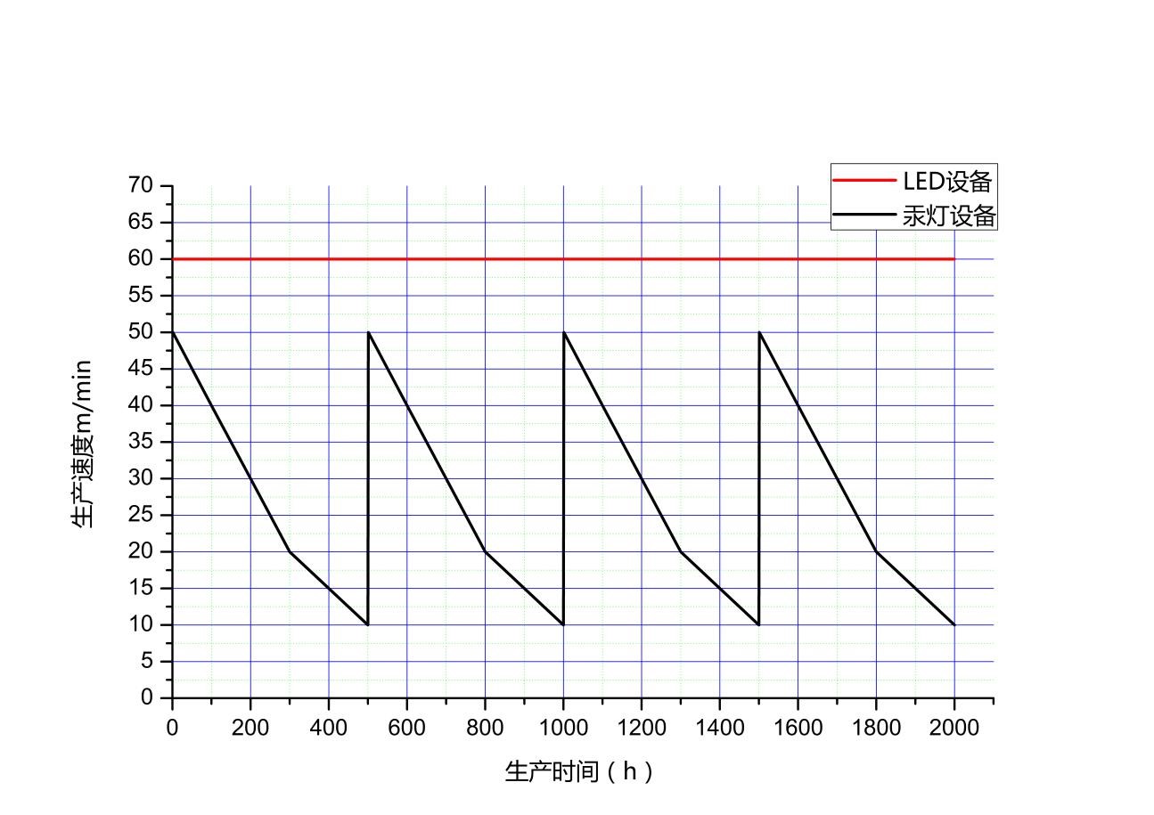 汞燈輻照設(shè)備與LED輻照設(shè)備生產(chǎn)速度曲線對(duì)比