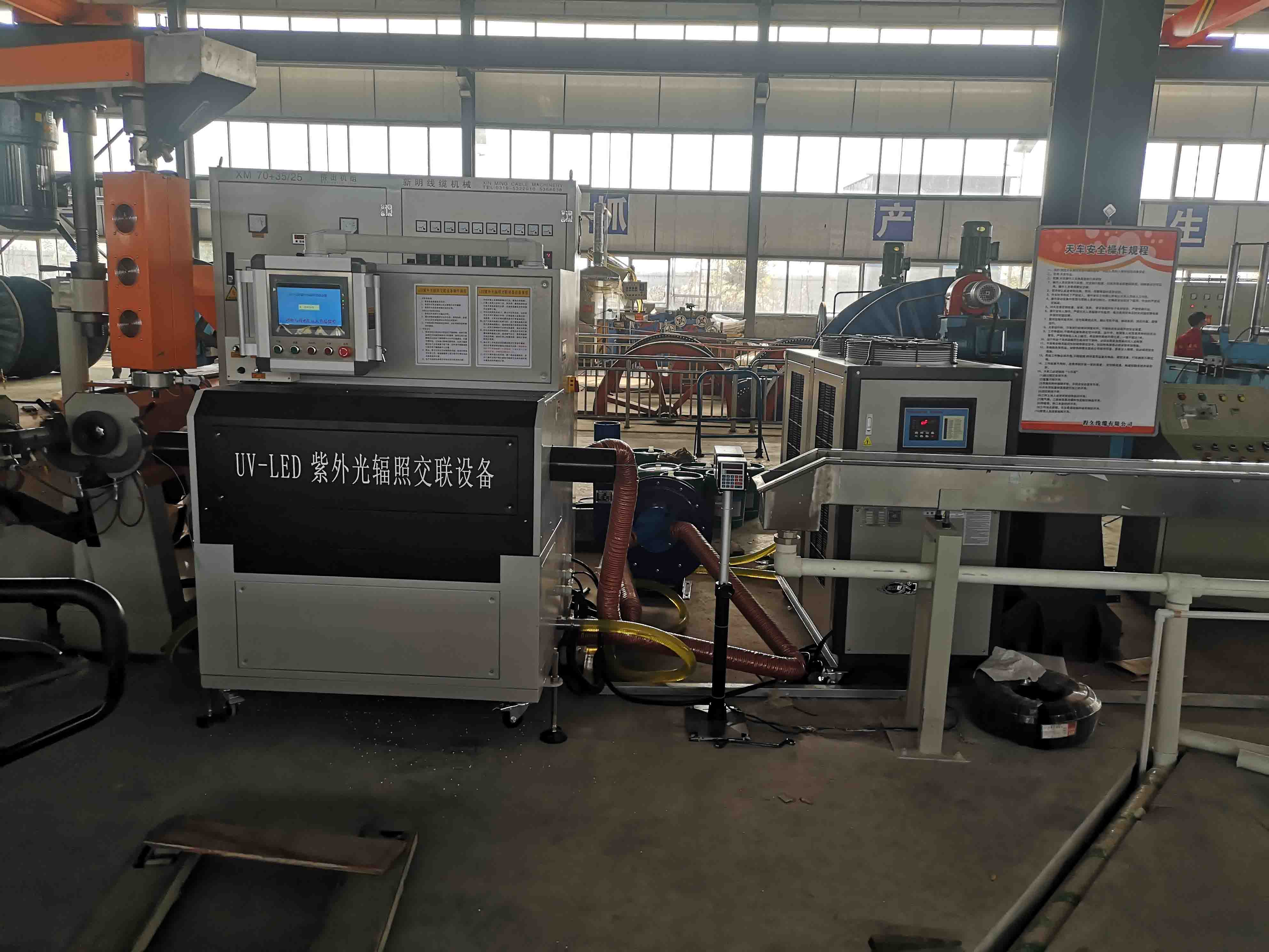 紫外光輻照電纜交聯(lián)設(shè)備均勻交聯(lián)厚度能達(dá)到2mm以上,可用于普通交聯(lián)聚乙烯電纜,阻燃交聯(lián)電纜等多種電纜的生產(chǎn)。生產(chǎn)速度高,應(yīng)用范圍廣,可與電線電纜生產(chǎn)線生產(chǎn)速度相匹配。